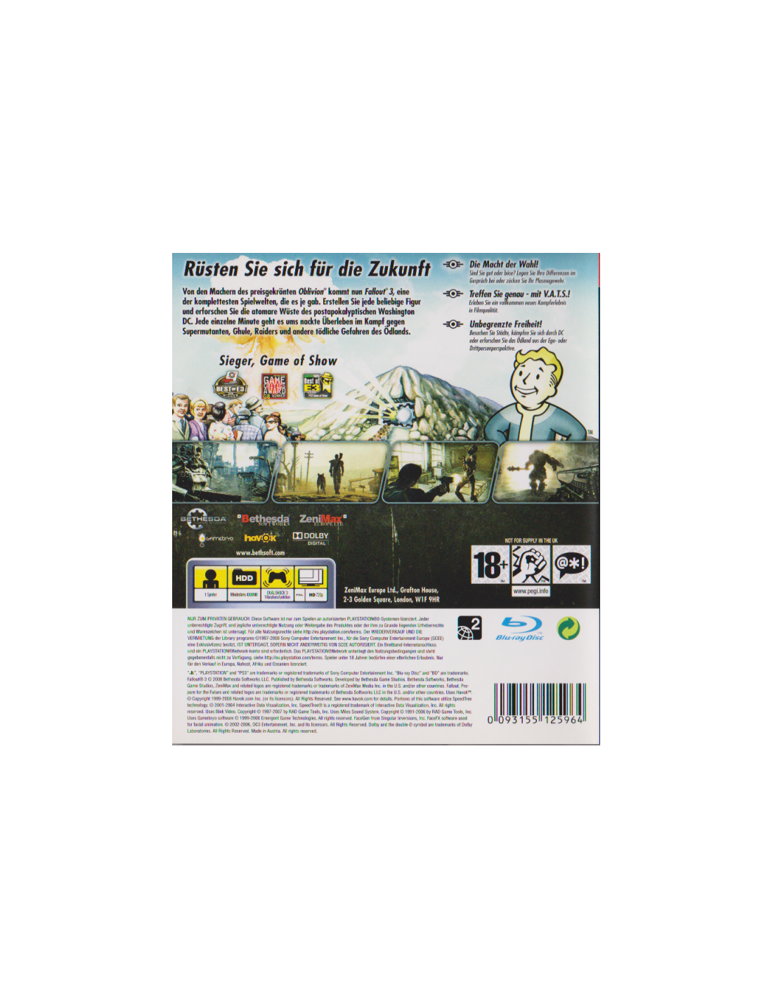 Von den Machern des preisgekrönten Oblivion kommt nun Fallout 3, eine der komplettesten Spielwelten, die es je gab. Erstellen Sie jede beliebige Figur und erforschen Sie die atomare Wüste des postapokalyptischen Washington DC. Jede einzelne Minute geht es ums nackte Überleben im Kampf gegen Supermutanten, Ghule, Raiders und andere tödliche Gefahren des Öllands.