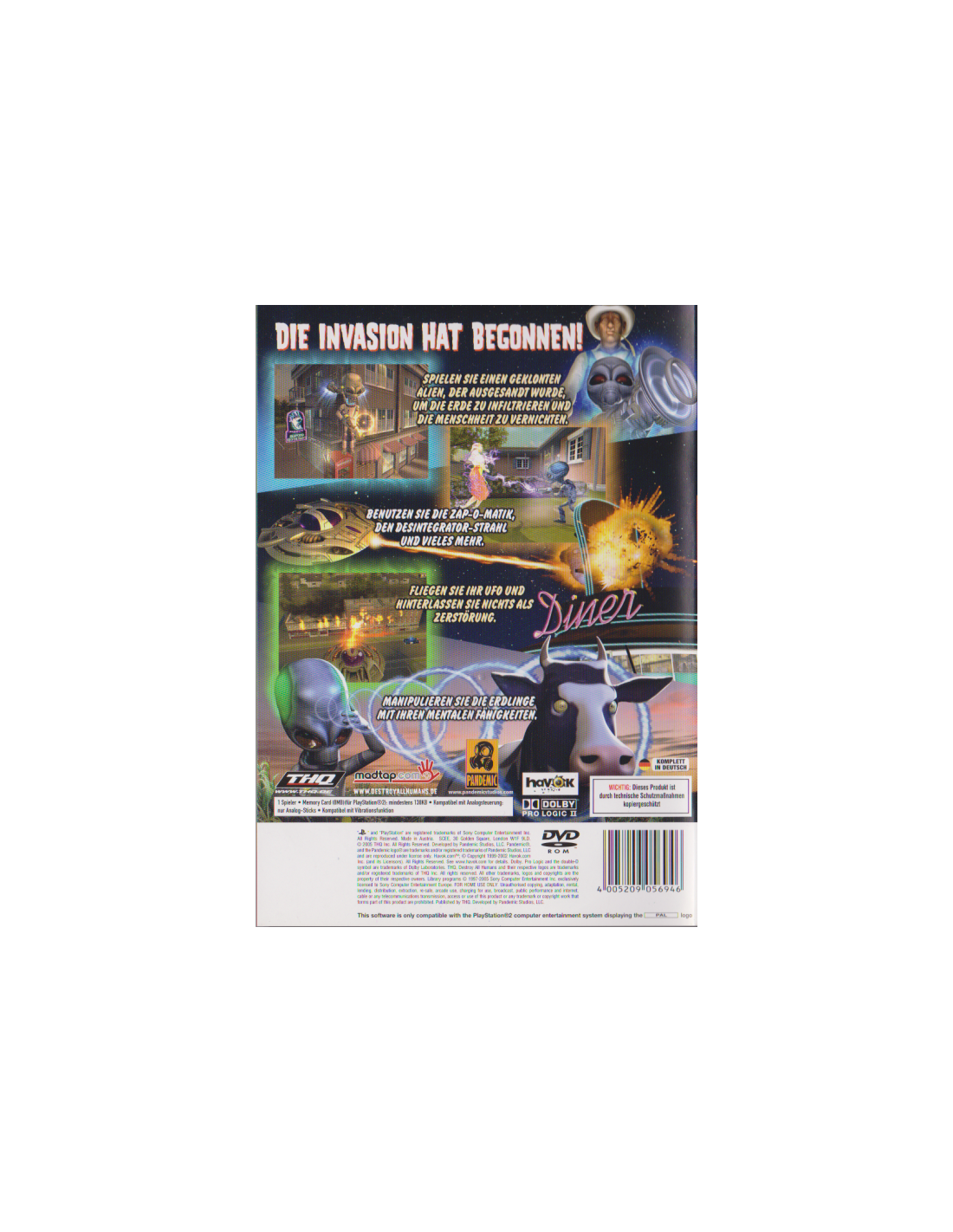 Die Fünfziger Jahre des 20. Jahrhunderts waren wahrlich eine interessante Zeit voller Neuerungen, Hoffnungen aber auch Ängsten und Befürchtungen. Die Studios in Hollywood trugen ihren Teil dazu bei, diese Ängste vor der Bedrohung eines atomaren Krieges und einer kommunistischen Weltherrschaft zu kanalisieren. Es entstanden Science-Fiction-Streifen wie Tarantula, Gefahr aus dem Weltall und Der Tag, an dem die Erde stillstand, die geschickt die Ängste einer ganzen Generation im übertragenen Sinne thematisierten. Was alle Hollywood-B-Movies vereint, ist die Tatsache, dass sie ihre Geschichten aus der Sicht der bedrohten Menschen erzählen. Wieso aber nicht einmal den Spieß umdrehen und eine Story aus Sicht der Außerirdischen zeigen? Seien wir doch einmal ehrlich: haben wir uns nicht schon oft beim Betrachten eines SciFi- oder Horror-Films gefragt, welche Beweggründe die fiesen Invasoren und Monster für ihr in unseren Augen so niederträchtiges Handeln vorzuweisen haben? Destroy All Humans! bietet nun endlich die Möglichkeit, in die Haut des Aliens zu schlüpfen. Mit unglaublichen Special-Effects und einer gehörigen Portion schwarzem Humor wird der Spieß umgedreht. Das Flair ist dasder 50er Jahre, die technische Umsetzung ist auf dem aktuellen Stand der Technik und nutzt die Fähigkeiten der PlayStation 2 überaus eindrucksvoll aus.