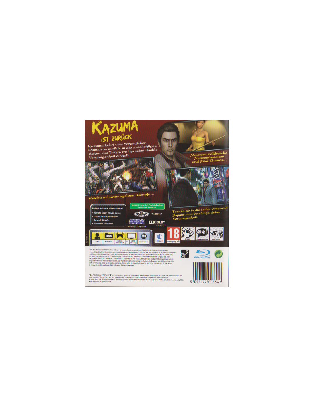 In der Fortsetzung des Action-Abenteuers erkundet der Spieler in der Rolle von Kiryu Kazuma detailreiche, realistische Umgebungen, nimmt an einer Vielzahl von einmaligen Minispielen teil und erlebt die bisher intensivste Kampferfahrung der Reihe. Neben bekannten Schauplätzen in Tokio, die bereits aus den ersten beiden Spielen bekannt sind, werden die Fans außerdem einen ganz neuen Schauplatz entdecken: die tropische Insel Okinawa, wo Kazuma zusammen mit seiner Adoptivtochter Haruka ein Waisenhaus leitet. Doch ist ihm keine Ruhe in seiner idyllischen Zuflucht vergönnt, denn schon bald holt ihn abermals seine düstere Vergangenheit ein