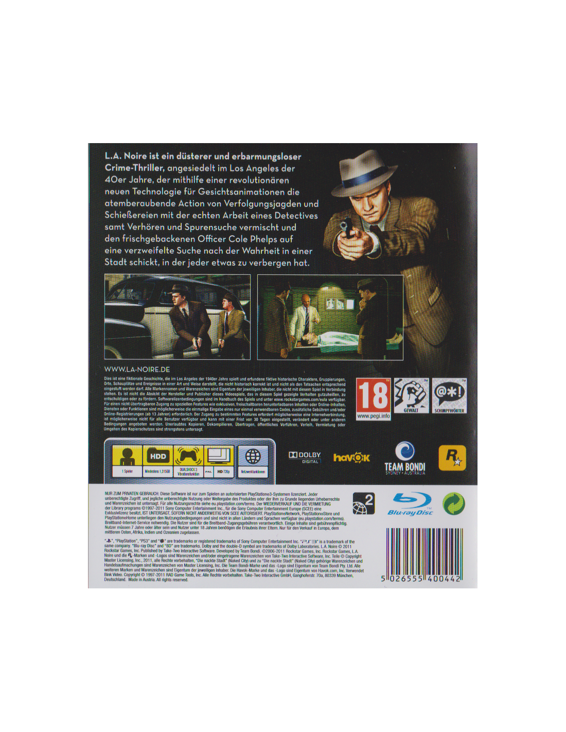 L.A. Noire ist ein Crime Thriller, der im Los Angeles der späten 40er Jahre kurz nach dem Zweiten Weltkrieg angesiedelt ist. Im Kern dieser Kooperation zwischen dem australischen Studio Team Bondi und Rockstar Games steht eine brandneue Form von Gameplay, eingebettet in eine düstere und packende Story und aufwendig produziert mit den bekannten Rockstar-Qualitäten im Bereich Atmosphäre und Detailtreue.