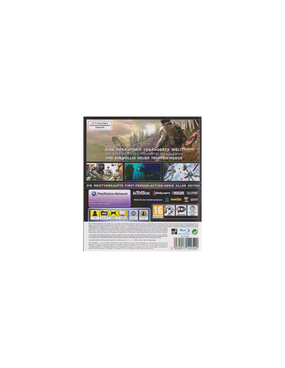 Call of Duty: Ghosts, das eine der größten Entertainment-Marken der Welt einen gewaltigen Schritt nach vorne bringt. Das neueste Kapitel in der Call of Duty-Reihe wartet mit frischen Ideen auf und versetzt die Spieler auf die Seite einer gelähmten Nation, die nicht mehr um Recht und Freiheit kämpft, sondern ums nackte Überleben.