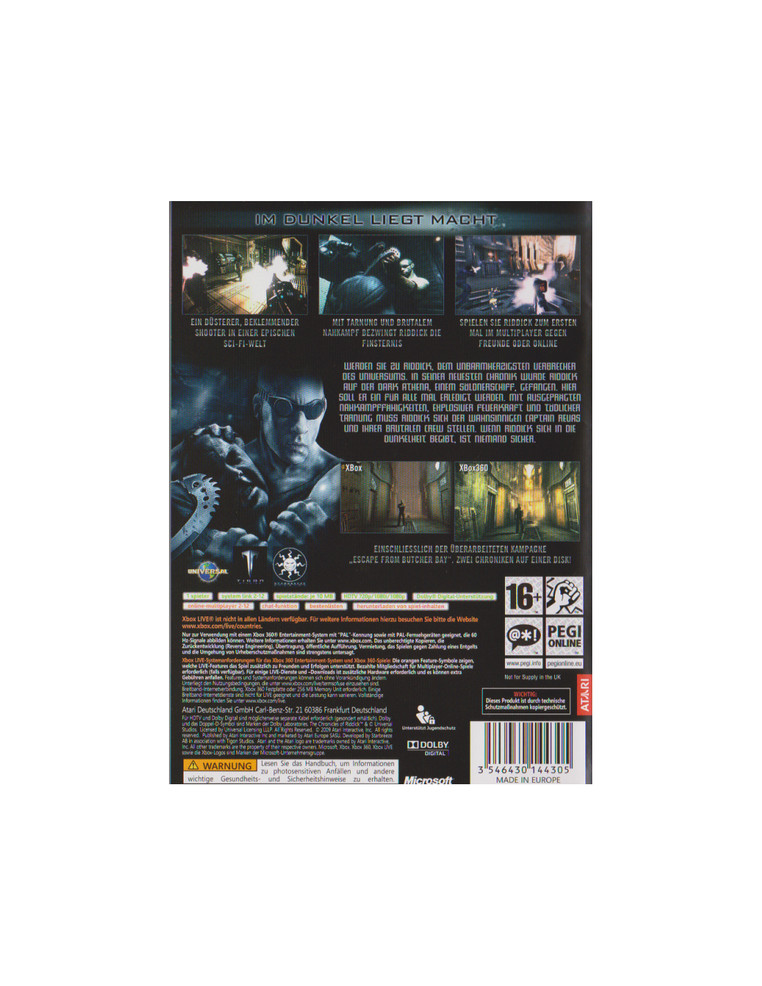 Nach dem großen Erfolg der Filme und des Games "Escape from Butcher Bay" ist Richard B. Riddick endlich zurück auf dem Bischirm seiner Fans. Übernehme die Kontrolle über den coolsten Anti-Helden des Universums und Kämpfe Dich durch ein brandneues Next-Gen Abenteuer!
