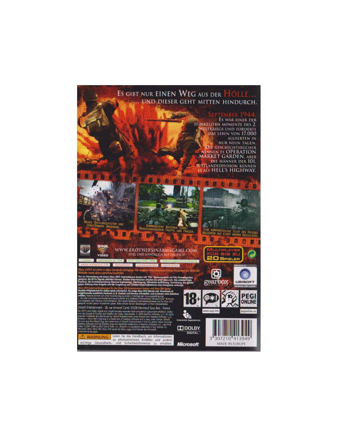 Brothers in Arms Hell’s Highway führt die Brothers in Arms-Serie zur nächsten Generation der Spiele. Mit topaktueller, hochklassiger Grafik und seinem Sound, neuen Spieleigenschaften und einem komplett überarbeiteten Online-Modus versetzt Brothers in Arms Hell’s Highway den Spieler in eine packende WWII-Erfahrung, wie er sie nie zuvor erlebt hat.