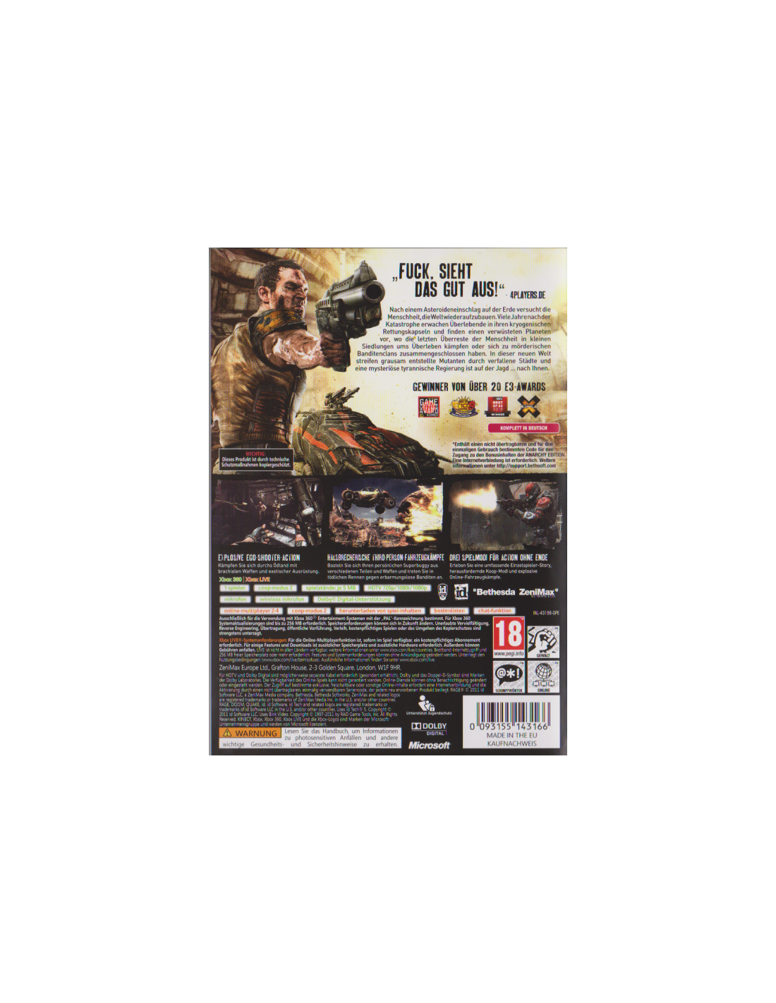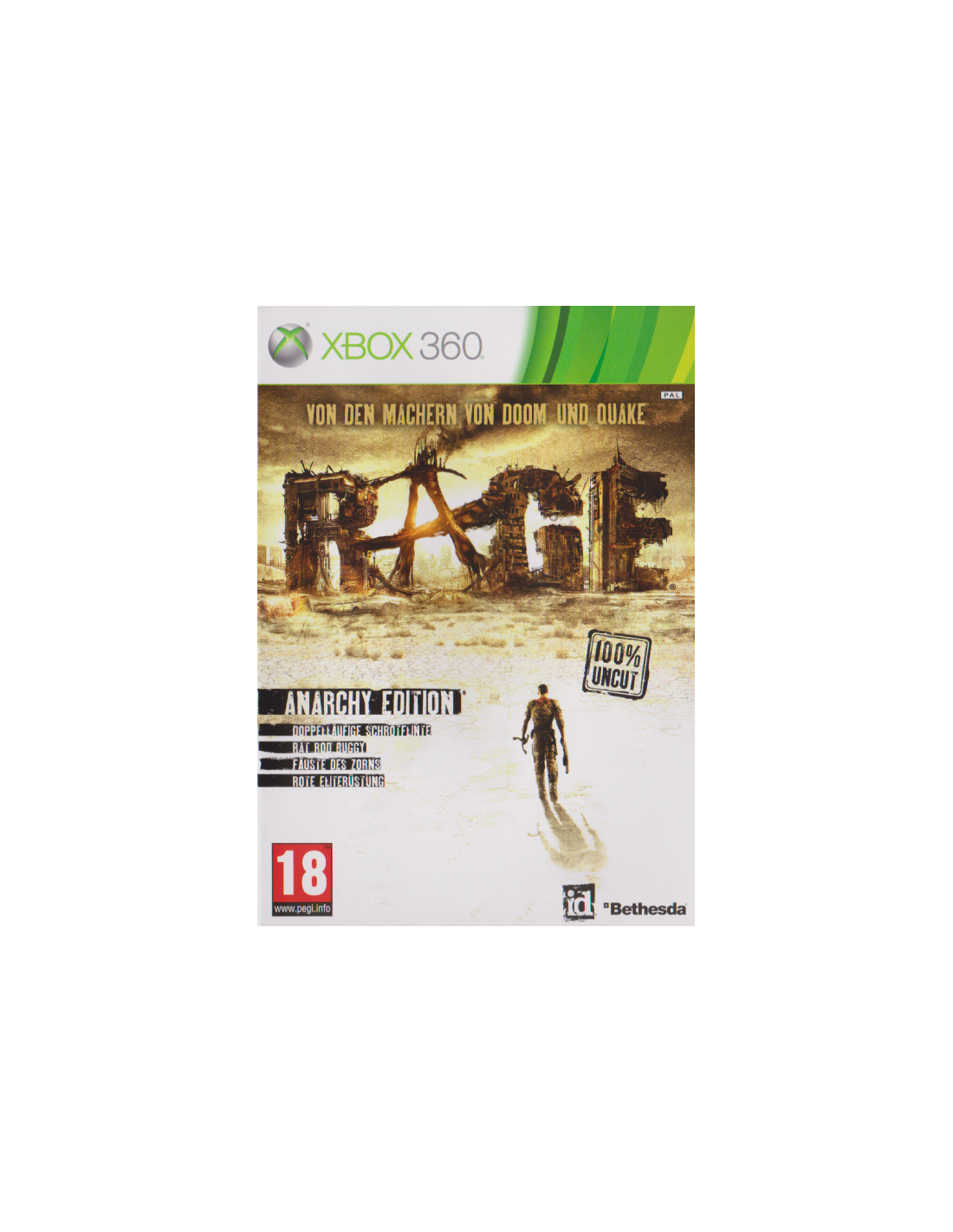 RAGE ist ein bahnbrechender First-Person-Shooter, der in der nicht allzu weit entfernten Zukunft angesiedelt ist. Nach einem Asteroideneinschlag, der eine verwüstete Erde zurücklässt, finden sich die Spieler in einem gewaltigen Ödland wieder, in dem die gesamte Menschheit daran arbeitet, sich wieder aufzurappeln. Dabei trifft man auf Banditen-Gangs, Mutanten und Vertreter eines unterdrückenden Regimes, das sich ganz besonders für den Hauptcharakter interessiert. Unterstützt durch die revolutionäre id Tech 5 Technologie, wird RAGE ein unvergleichbares Erlebnis mit wegweisender grafischer Darstellung.