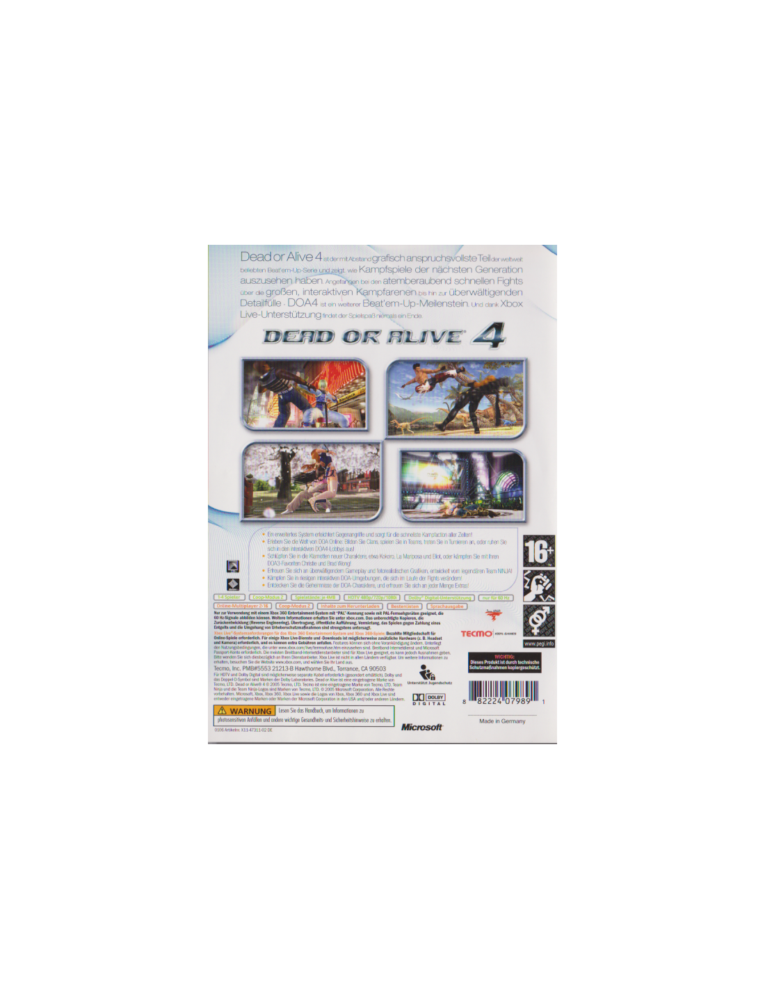 Dead or Alive 4 ist der mit Abstand grafisch anspruchsvollste Teil der weltweit beliebten Beat'em-Up-Seie und zeigt, wie Kampfspiele der nächsten Generation auszusehen haben. Angefangen bei den atemberaubend schnellen Fights über die großen, interaktiven Kampfarenen bis hin zur überwältigenden Detailfülle. DOA 4 ist ein weiterer Beat'em-Up Meilenstein. Und dank Xbox Live-Unterstützung findet der Spielspaß niemals ein Ende.