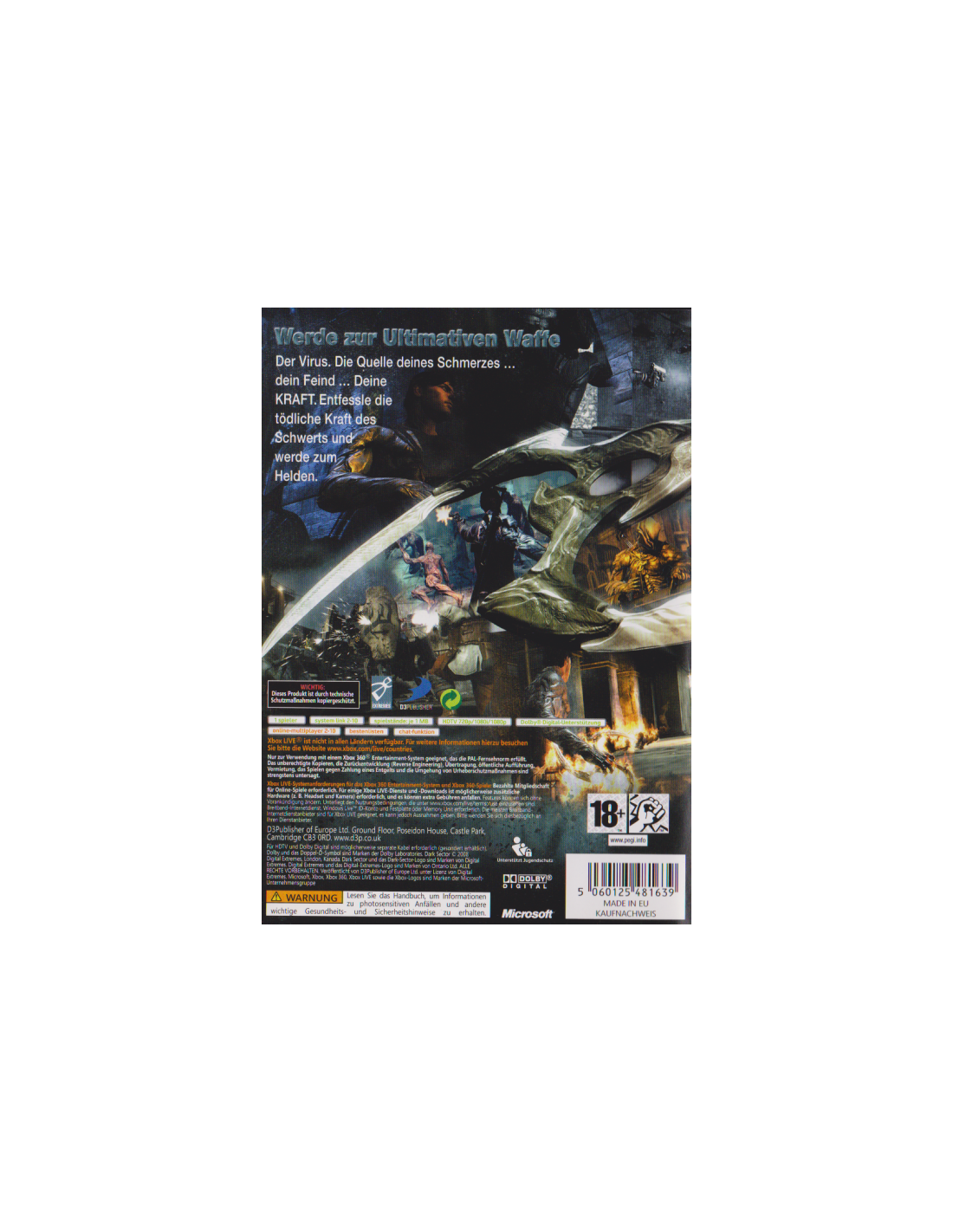 Lass dich von diesem düsteren 3rd-Person-Shooter infizieren und werde zum neuen Super-Helden! In Dark Sector erlebst du einen atemberaubenden Sci-Fi-Albtraum kurz nach Ende des Kalten Krieges.Als Agent Hayden Tenno führt dich deine Mission nach Lasria, einer chaotischen osteuropäischen Stadt am Rande des Abgrunds, die ein furchtbares Geheimnis birgt. Gerüchten zufolge soll die Stadt von einer mysteriösen Plage heimgesucht werden. Und so passiert es: Kaum hat Hayden seinen Job ausgeführt, wird er von einem unbekannten Gegner angegriffen. Hayden überlebt, trägt aber von nun an den gefährlichen Technocyte-Virus in sich, der Lasria vor kurzem ins Chaos stürzte.