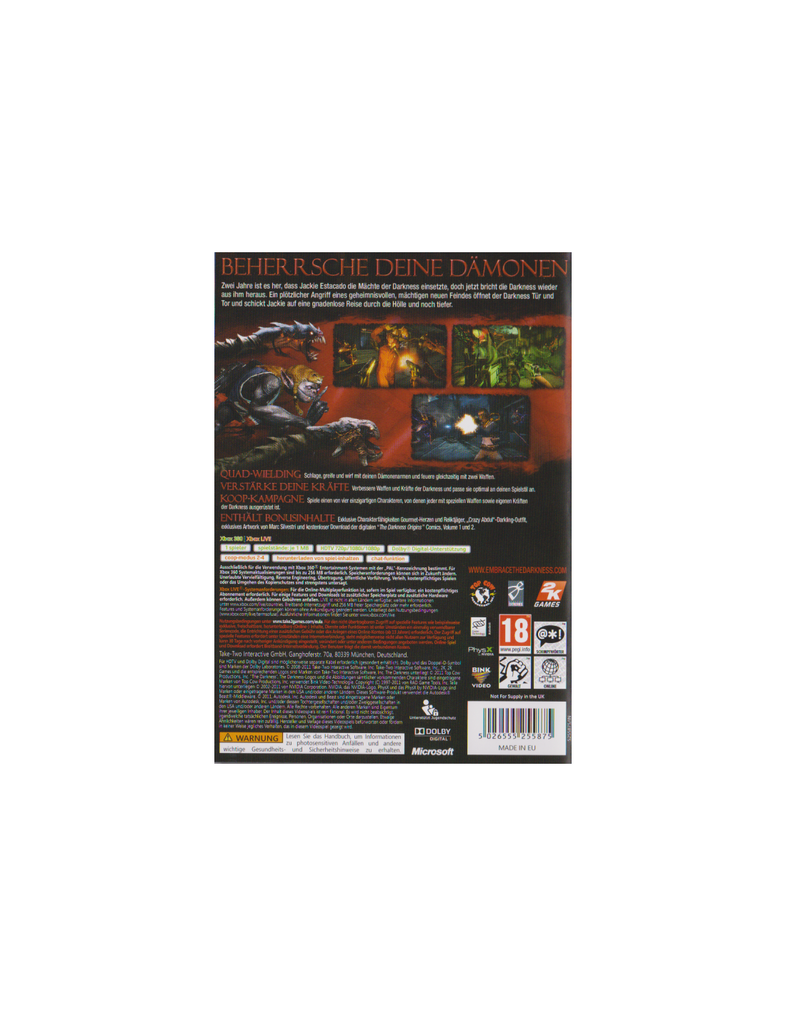 Die Fortsetzung des vielgelobten ersten Teils der Comicbuchadaption zieht dich tief in eine tragische Welt des Verbrechens und übernatürlichen Grauens. Gewohnt grandios setzt sich The Darkness II mit einem explosiven Gameplay, coolen Charakteren und einer außergewöhnlichen Grafik in Szene. Begib dich auf Jackie Estacados gnadenlosen Weg von Rache und Vergeltung und meistere die dämonische Kraft der Dunkelheit. Brachiale Action und eine filmreife Story garantieren viele Stunden fesselnden Spielspaß.