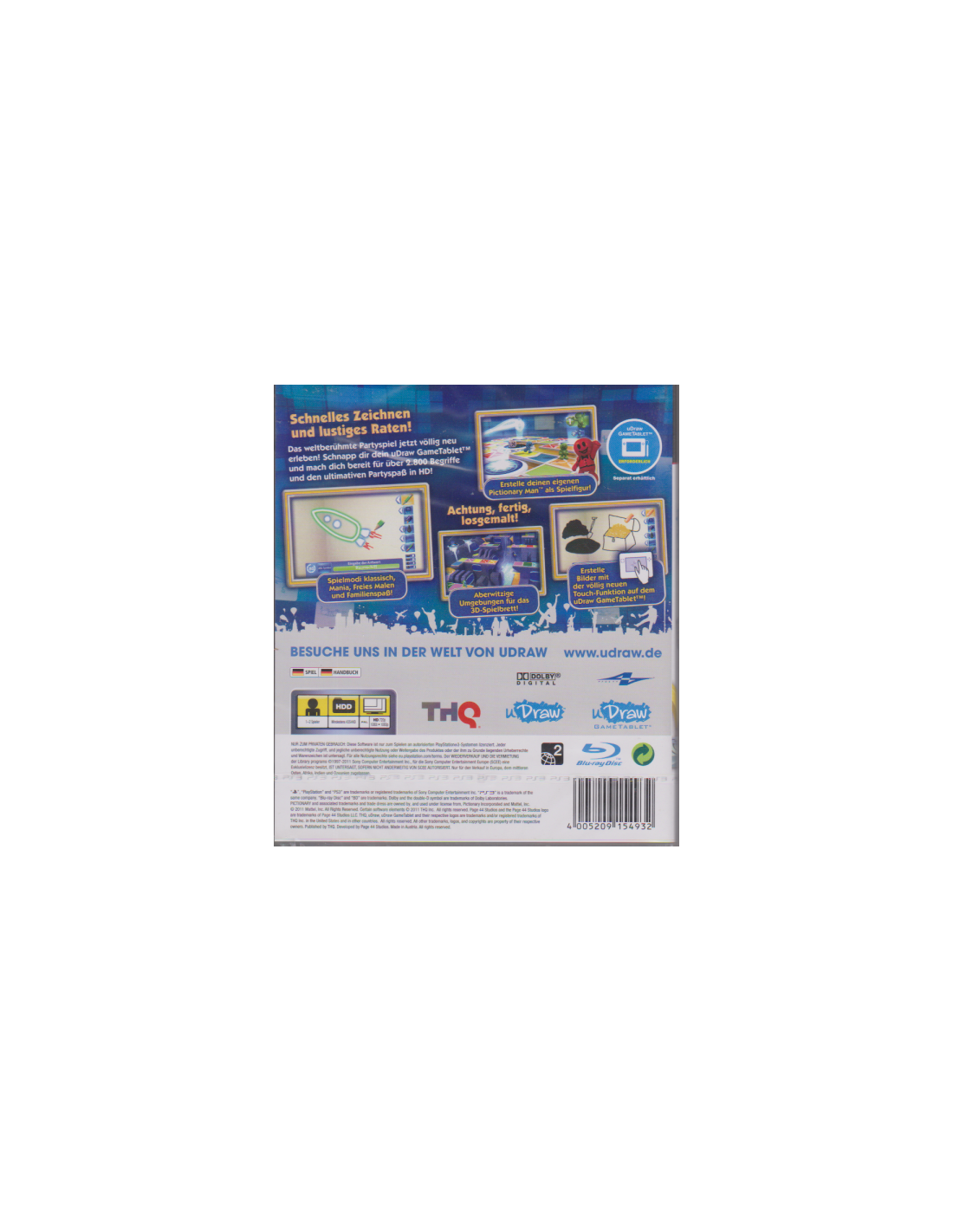 Pictionary wurde einer Kur unterzogen und zeigt sich mit neuer grafischer Oberfläche von seiner HD-Seite. Das beliebte Spielprinzip der Montagsmaler sorgt jetzt auch auf PlayStation3 und dem neuen uDraw GameTablet für witzige Partyabende. Es gilt, gezeichnete Begriffe schnellstmöglich zu erraten. Dabei kann das Spiel im klassischen Brettspielmodus sowie im Pictionary Mania-Modus gespielt werden, welcher nochmals erweitert wurde.